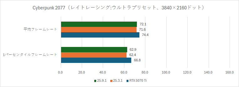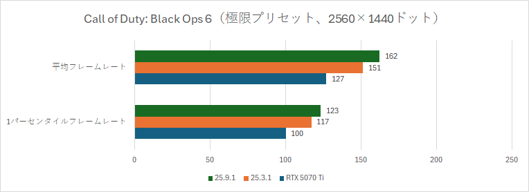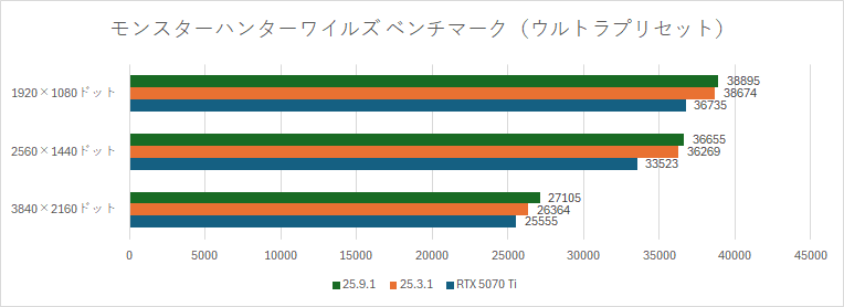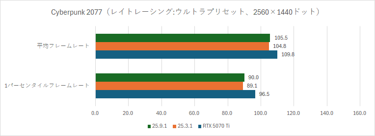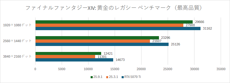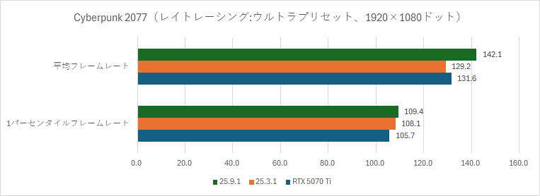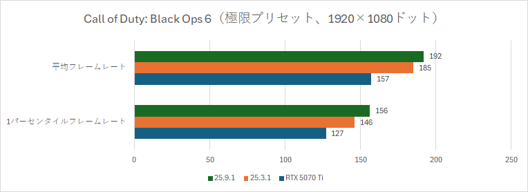 25.9.1は25.3.1からスコアーが6~10%ほど上昇。さすがにゲーム側の最適化があるためRTX 5070 Tiに届かないものの、1920×1080ドットでその差を5%にまで縮めている点は立派だ。