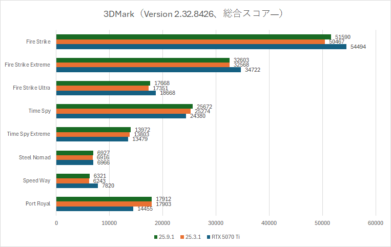 レイトレーシング性能を見る「Port Royal」でも、25.9.1と25.3.1でスコアーはほとんど変わらないものの、RTX 5070 Tiをかなり引き離す結果となっている。