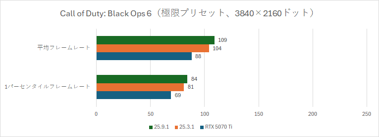 では、実際のゲームではどうなのか。「Call of Duty: Black Ops 6」の結果に移ろう。ここでは、「極限プリセット」を適用したうえで、ゲームに用意されたベンチマークモードを実行している。
