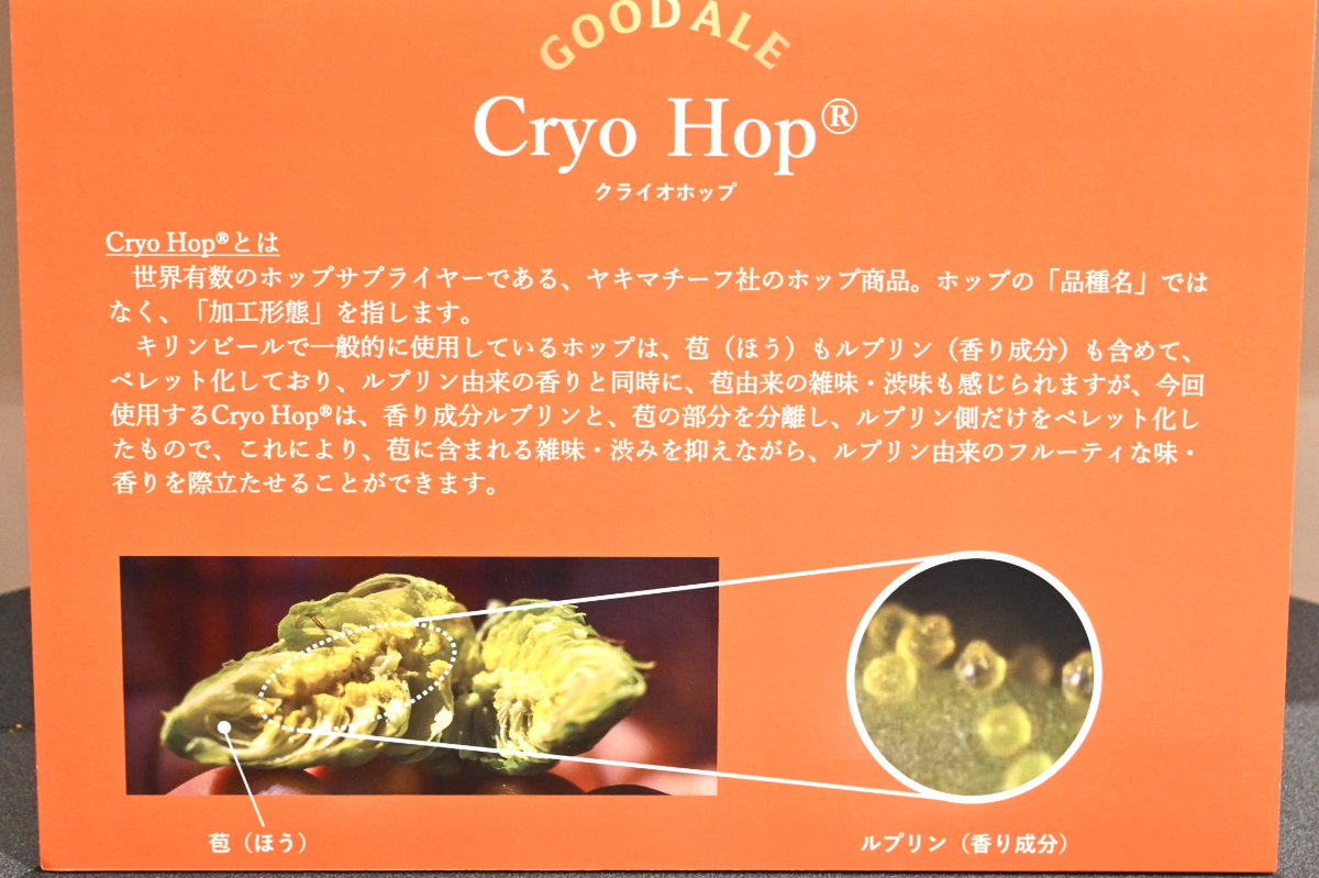 さらに、香りの決め手となるのが「クライオホップ(Cryo Hop)」。世界有数のホップサプライヤー・ヤマキチーフ社による特許取得のプロセスで加工され、香り成分であるルプリンだけを取り出したペレット商品です。雑味や渋みを抑えつつ香りを際立たせることができ、クラフトビール界隈でも注目されています。キリングッドエールへの採用は、キリンビールとして初めてとなります。