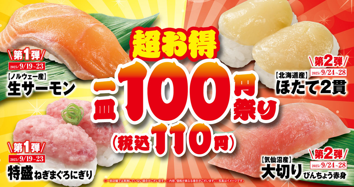 くら寿司は9月19日から、人気ネタを特別価格110円で販売する「100円(税込110円)祭りフェア」を期間・数量限定で開催します。