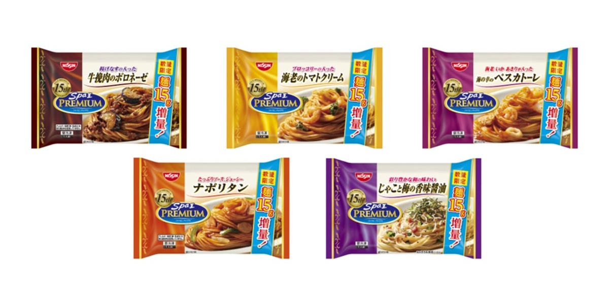 日清食品冷凍は「冷凍 日清スパ王プレミアム 麺15g増量品」5品を9月下旬より数量限定で販売します。価格はオープン。