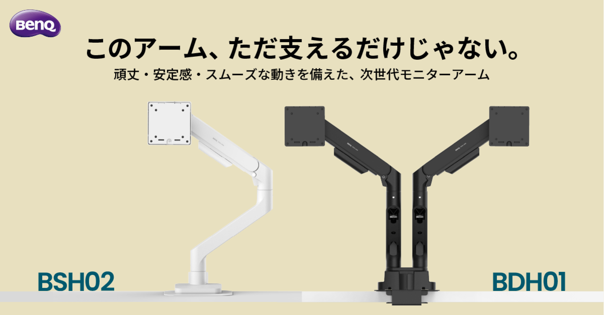 ベンキュージャパンは9月19日、同社初となる高耐荷重デュアルモニターアーム「BDH01」と、人気のシングルモニターアーム「BSH02」の新色ホワイトモデルを発売すると発表した。いずれもオープン価格で提供され、一般的なオフィス用ディスプレイからウルトラワイドモニターまで幅広く対応可能だ。