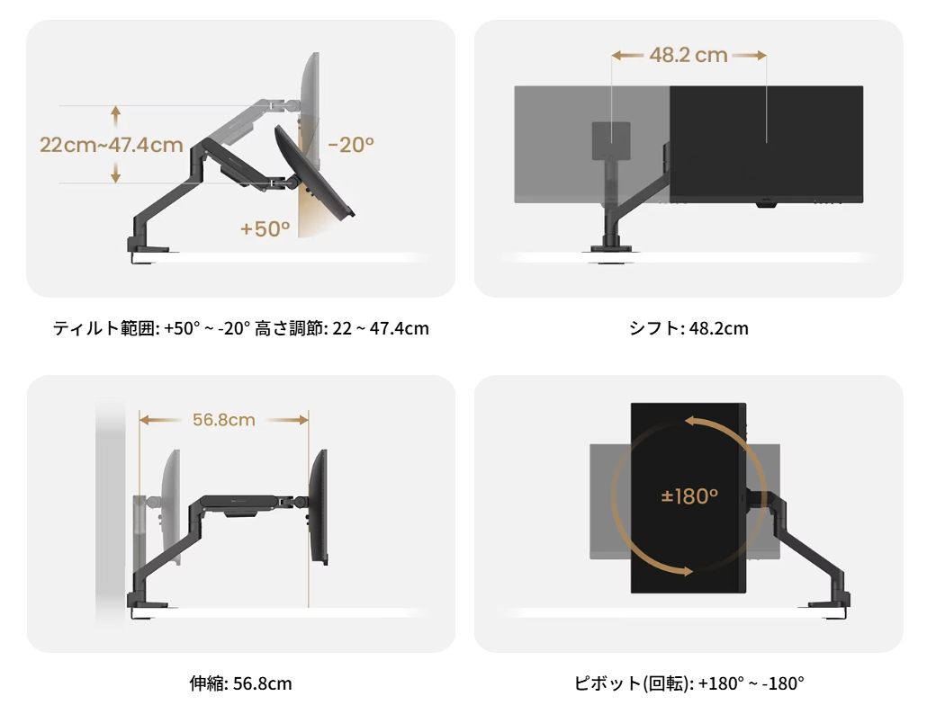 可動域も広く、ティルトは-20°〜50°、スイベルは左右±90°、回転は±180°に対応。高さ調整や縦横切り替えもスムーズに行え、作業スタイルに合わせた柔軟な設置が可能となっている。さらに、デスク厚12〜50mmに対応し、クランプ固定とグロメット固定の両方をサポート。補強プレートも付属し、デスク天板の傷やたわみを防ぐ設計だ。