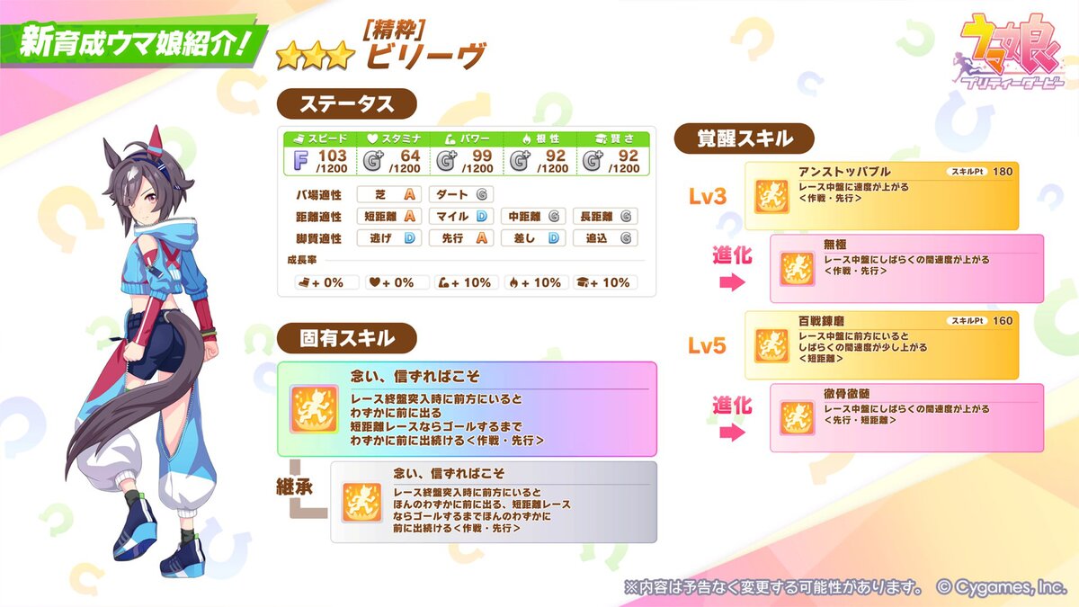 また、公式Xにてビリーヴの性能もあらかじめ紹介。固有スキル「念い、信ずればこそ」の効果が「ゴールするまで」と書かれているところに「異様に強い」「固有つっよ!」と注目が集まっているようだ。「ビリーヴ」ガチャは9月19日12時~9月29日11時59分までとなる。