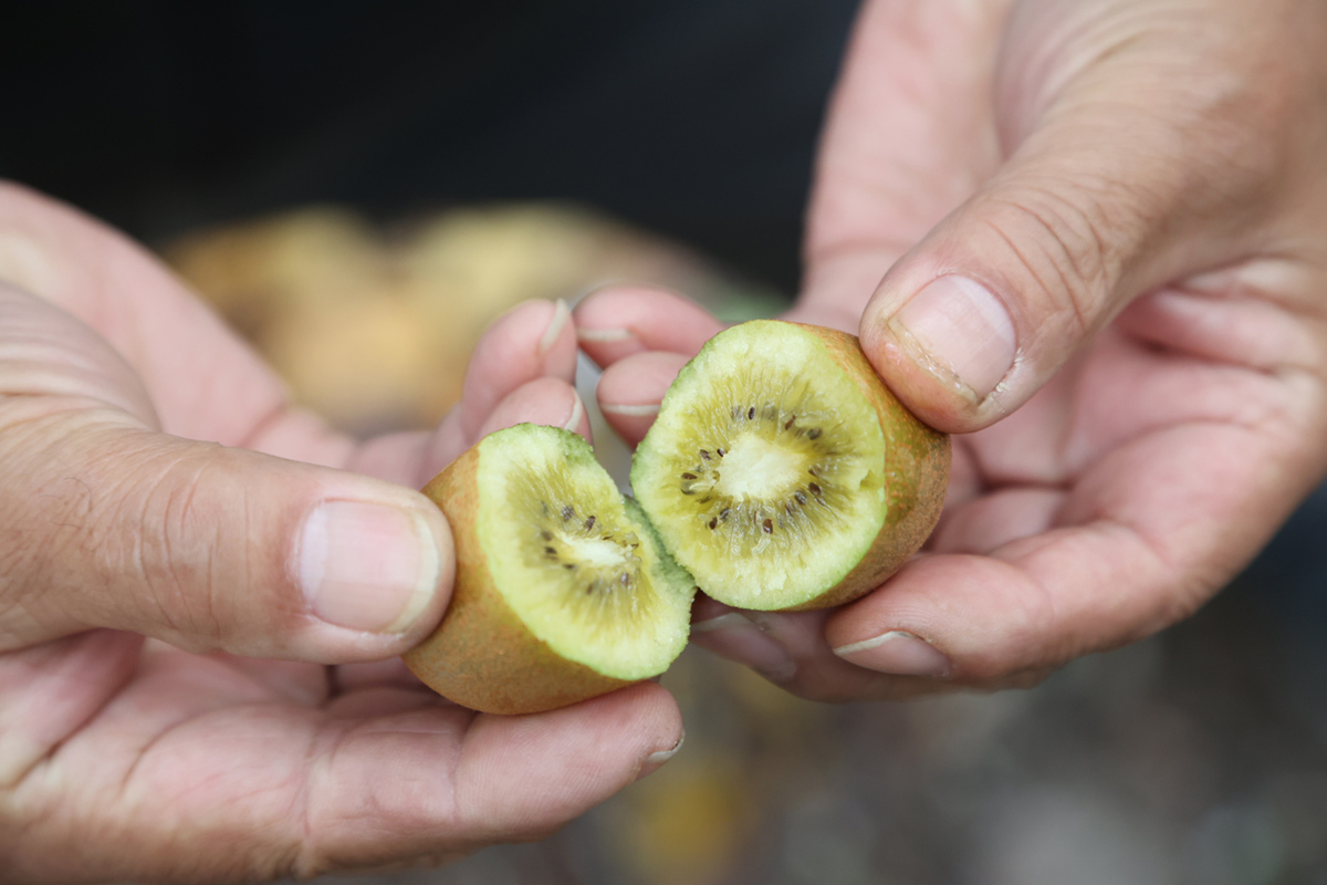 使用されるのは香川特産のブランド果実「キウイのたまご」。小ぶりで一口サイズのキウイを指で割って食べるのが特徴で、酸味が少なく和三盆のようなジューシーな甘さが楽しめるといいます(果汁0.2%)。