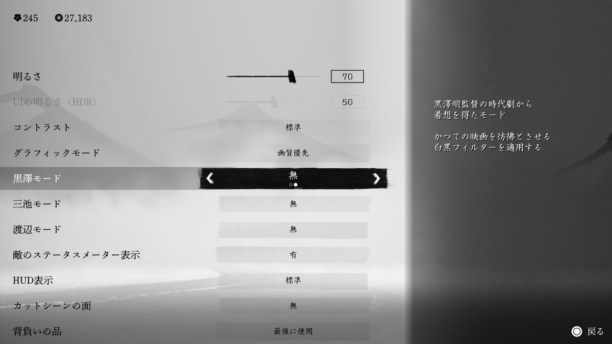 また、グラフィック設定のなかには映画界の巨匠、黒澤明監督や渡辺信一郎監督、三池崇史監督の作品に影響を受けたモードが存在。白黒になる「黒澤モード」、泥や血の表現が増して視界が悪くなる「三池モード」、渡辺監督が手掛けたオリジナルのLo-Fiが流れる「渡辺モード」などを切り替えできる。