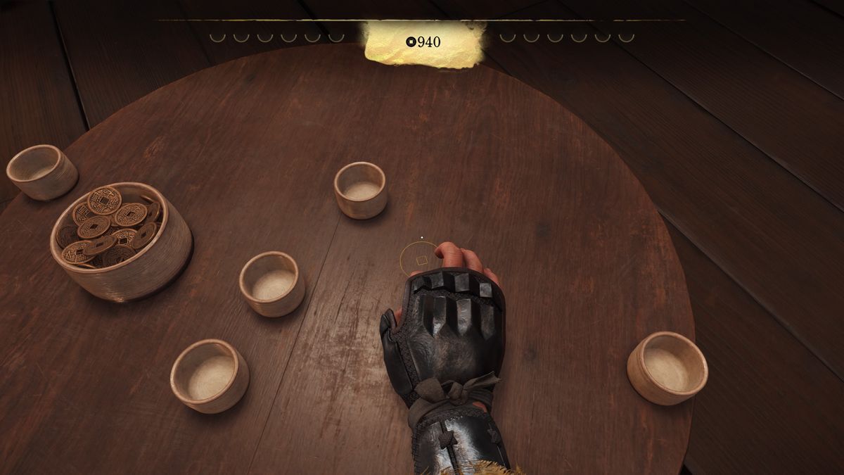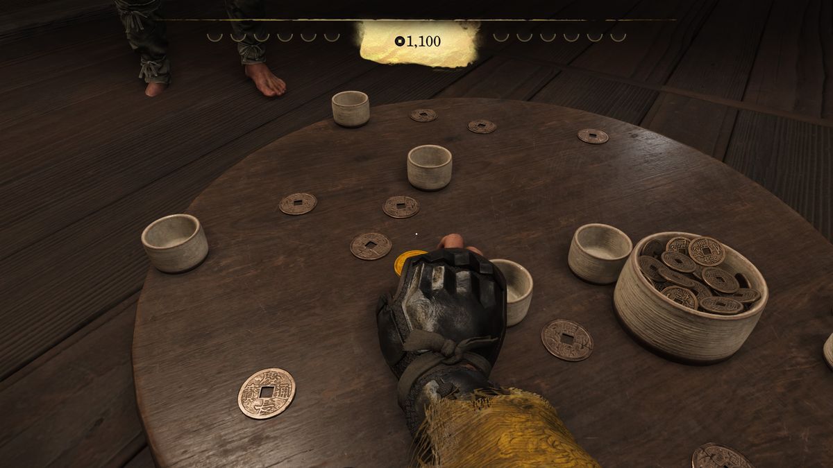 銭弾きは、卓上に散らばった銭をデコピンで飛ばし、ほかの銭にぶつけていくミニゲーム。DualSense ワイヤレスコントローラーのアダプティブトリガーを使った、絶妙な力加減が求められるのが特徴だ。