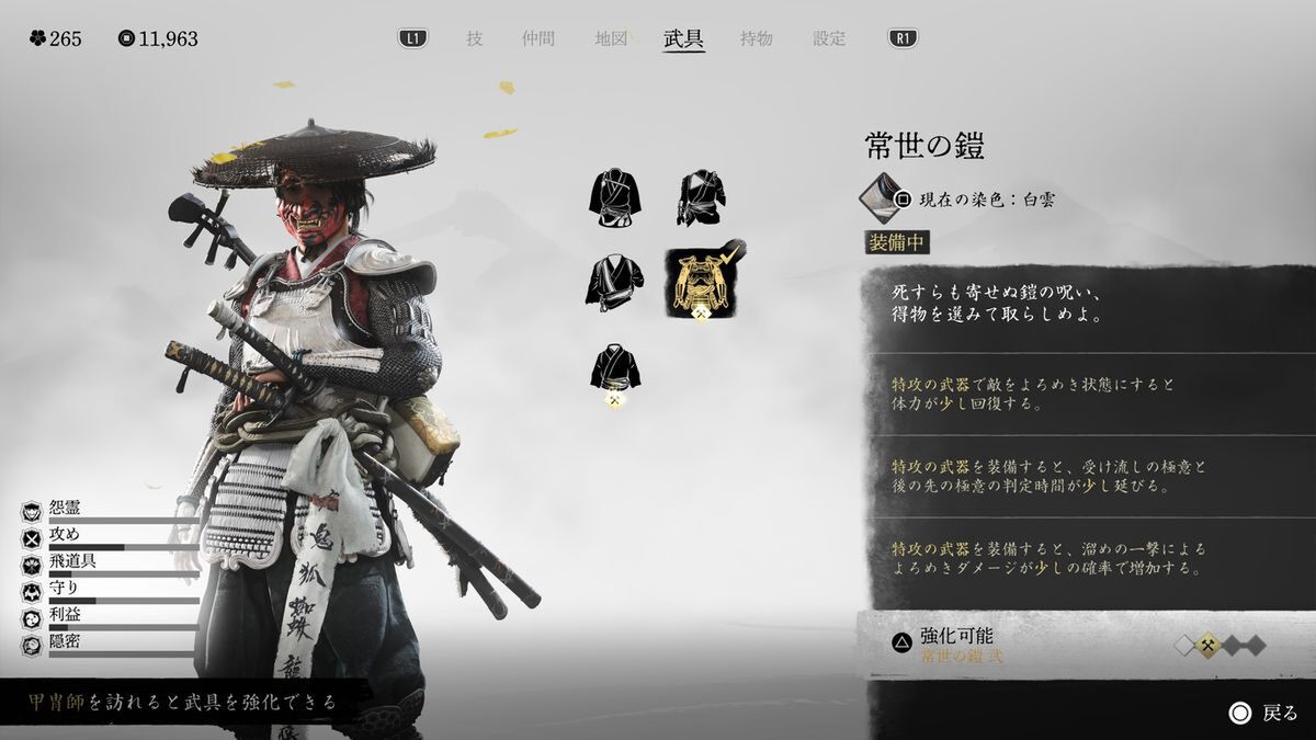 そのほか、寄り道をすれば新たな「鎧」が手に入ることも。頭装備や面は見た目が変わるだけだが、鎧は特殊効果があるので、しっかり強化して選びたい。鎧によって敵を「腰抜け」の状態異常にしやすくするものや、「弓矢」が強化されるもの、「闇討ち」がしやすくなるものなどがあった。