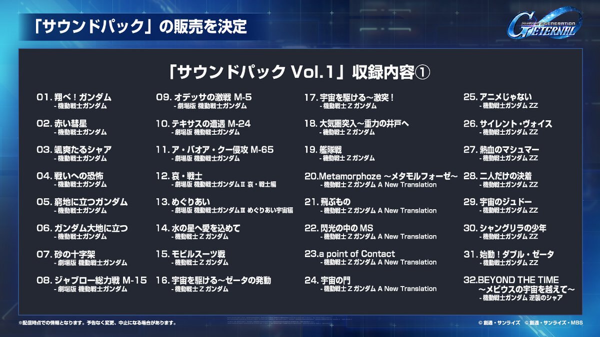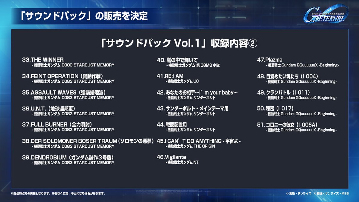 BGM切り替え機能で選べる楽曲を追加できる「サウンドパック」の発売が決定した。9月30日に販売開始を予定している「Vol.1」では51曲を収録。ぜひ入手してお気に入りの楽曲でジージェネエターナルを楽しもう。