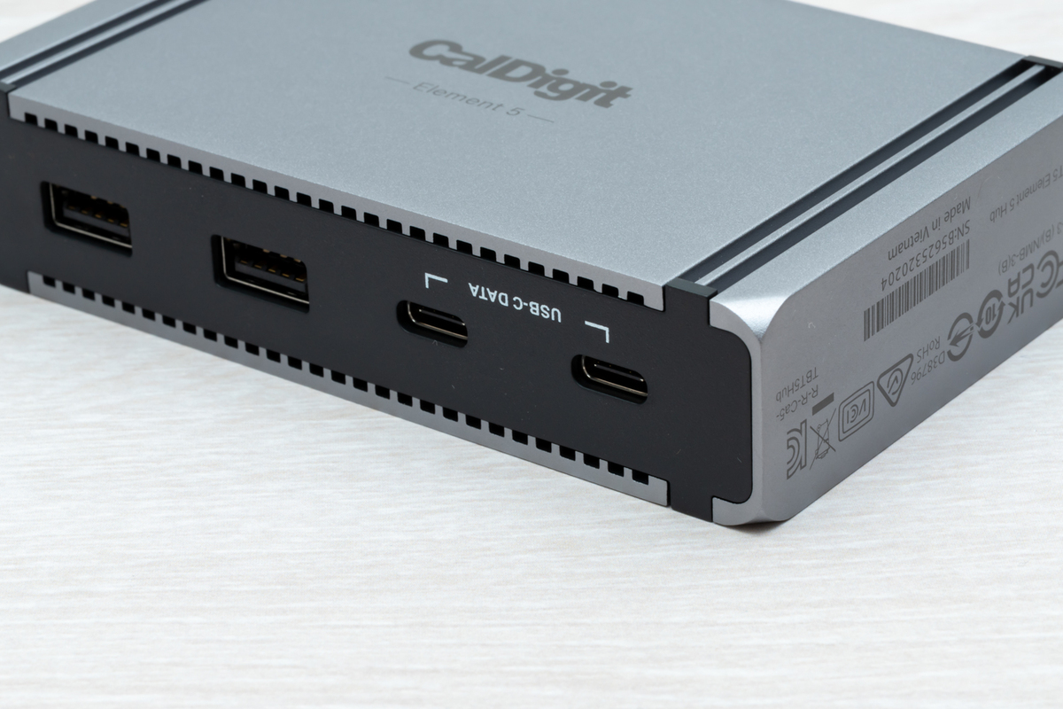 CalDigitは、機能面だけでなく、Macと相性抜群なスタイリッシュなデザインで人気だ。「Element 5 Hub」では、これまでのスペースグレイから、ガンメタに近くなった感じ。ポート部のブラックとのツートンカラーが、個人的にはお気に入りだ。
