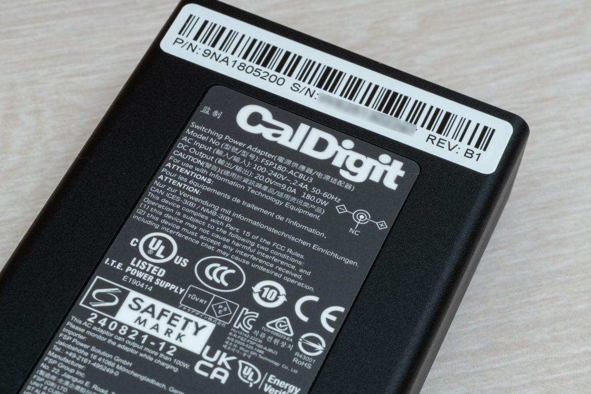 基本のスペックは、Thunderbolt 5ポートはホストPC接続用1基、周辺機器デバイス用Thunderbolt 5ポートが3基。そして転送速度10GbpsのUSB 3.2 Gen2 Type-Cが2基、USB 3.2 Gen2 Type-Aが3基の計5基が搭載されている。180W ACアダプターが付属し、ホストPC接続用から90W。そして3基のデバイス用Thunderbolt 5ポートからはそれぞれ15W、5基のUSBポートからはそれぞれ7.5Wの電力を供給できる。