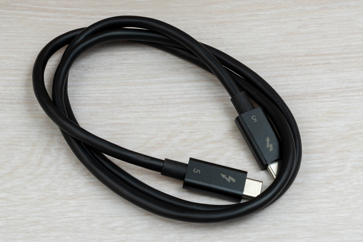 M4 Mac miniにつなげていろいろと試す前に、付属品を確認しておこう。ホストPCと離して置くこともできる80cm長のThunderbolt 5ケーブルのほか、180W対応ACアダプター、ミッキープラグ式電源ケーブル、ゴム足と積み重ね用ゴム足となっている。