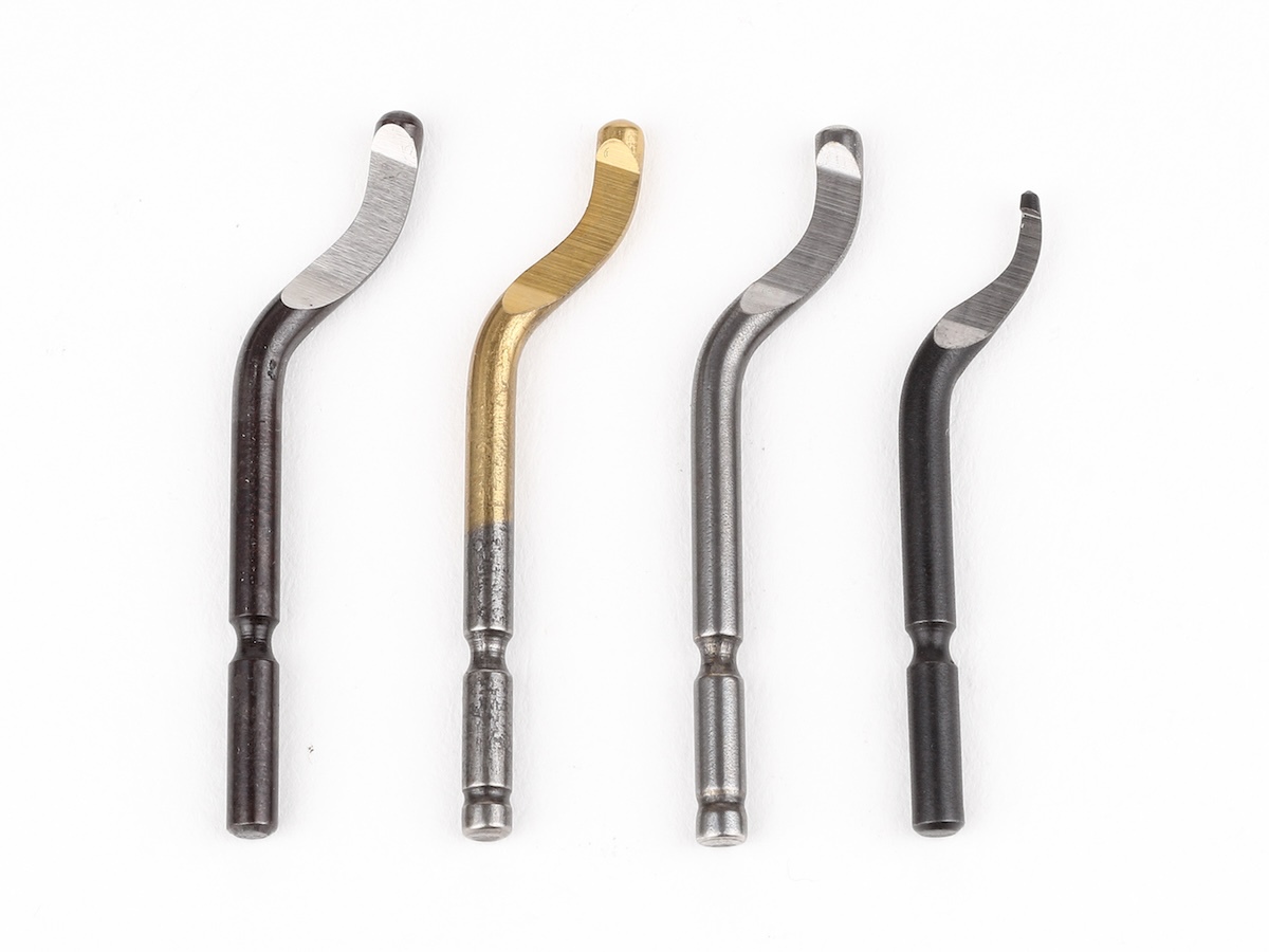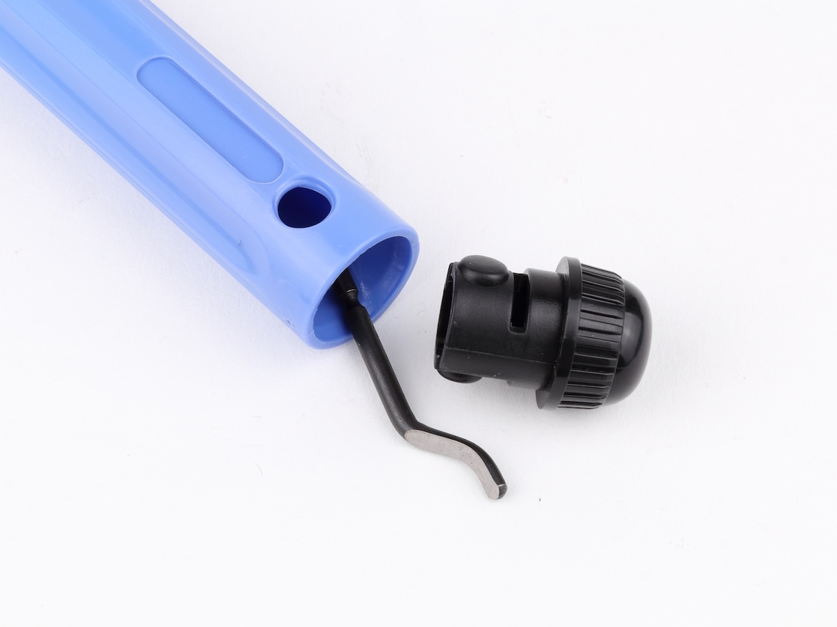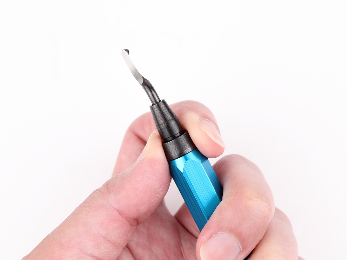 ただ、直線部などはこれで十分のですが、ちょっと困るのが曲線部。とくにパイプの内側などはヤスリで削りにくいうえ、カッターの刃も当てにくいというのが厄介です。こういった部分のバリ取りで活躍してくれるのが、回転式のブレードを持つバリ取り工具。
