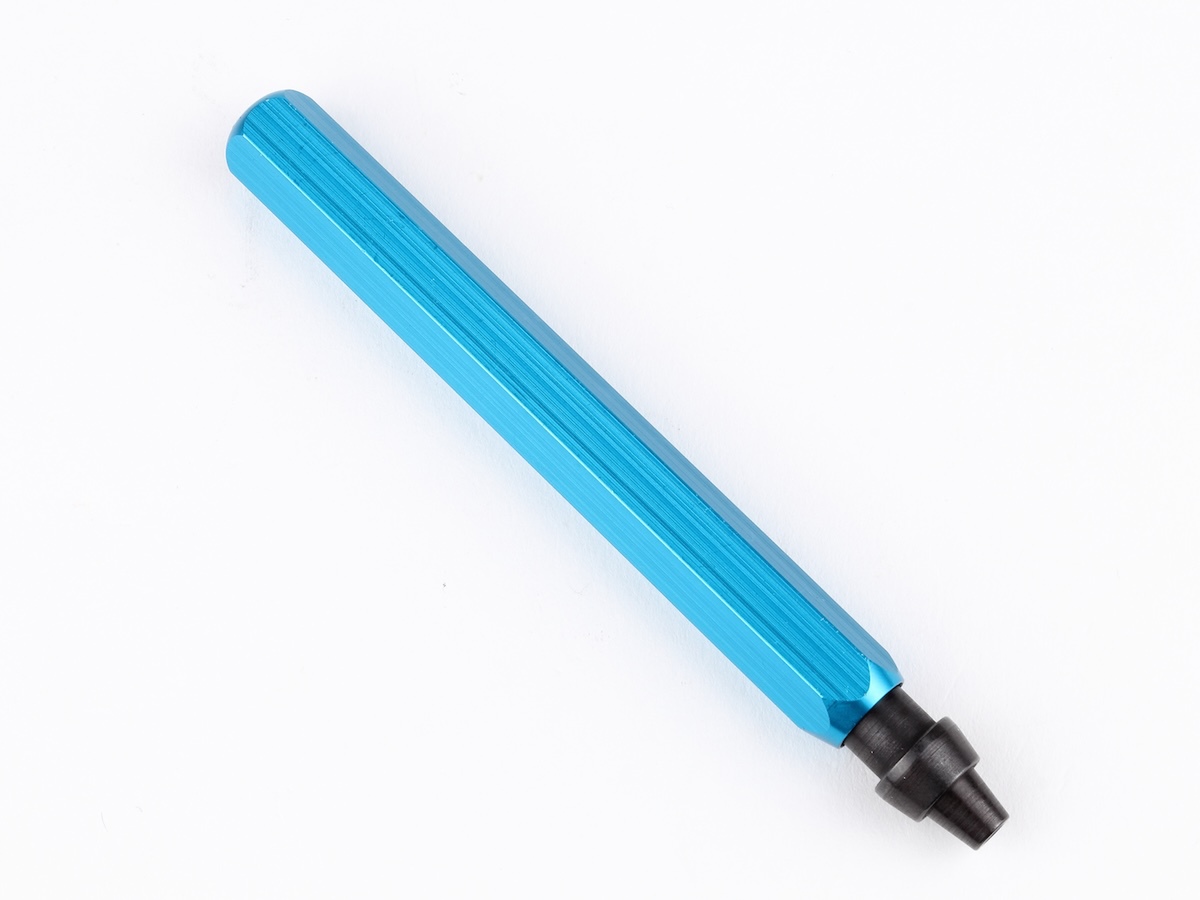 最大径約14mm、長さ約125mm、重量約47gの金属製ハンドル。細身のアルミボディで、先端のブレード装着部はスチールでしょうか。手にした感じは重量感のある太めのペン、といった感じで、細かい作業でも安定して使えそうな雰囲気があります。