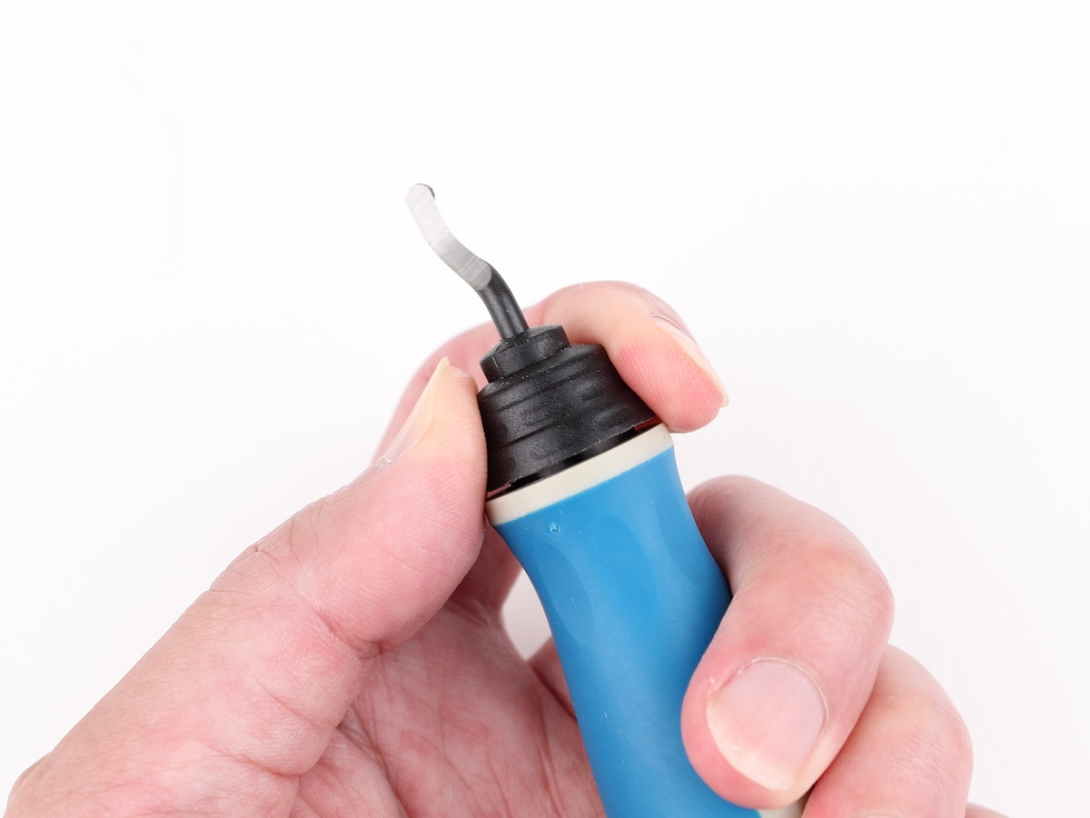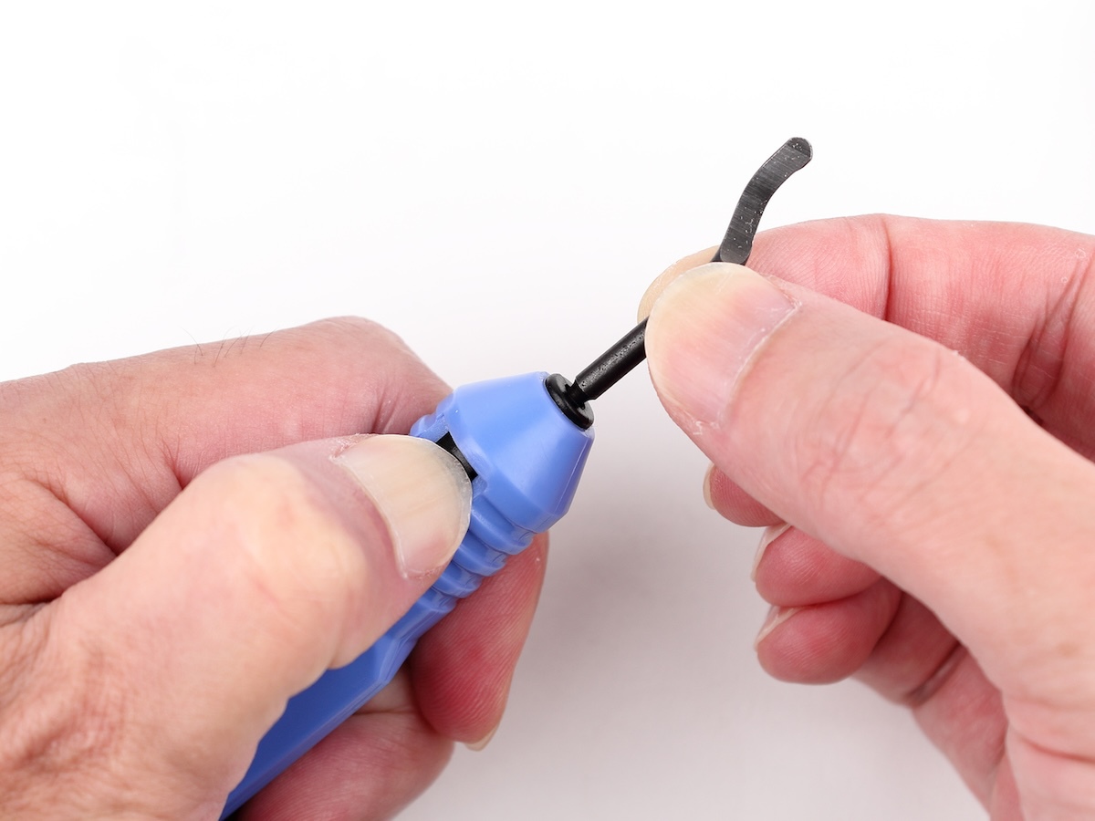 ブレードの装着は、先端首の部分を押し下げてブレードを挿し込み、手を放すだけ。抵抗なくスッと入るので、先にブレードを挿し込んでから首の部分を押し下げても入ります。外し方はこの逆で、首の部品を押し下げて引き抜くだけです。