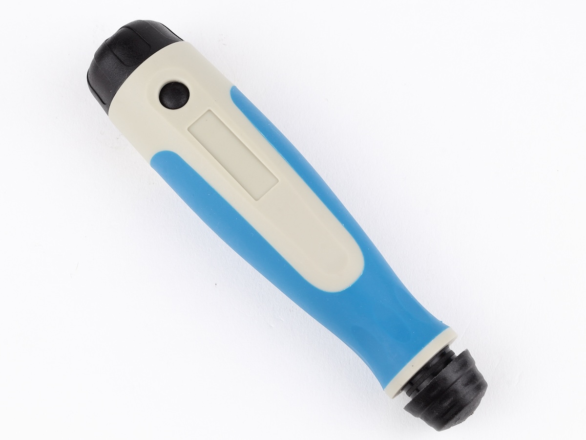 最大径約23mm、長さ約126mm、重量約24gのプラスチック製ハンドル。結構太目ですが寸胴なのと、廉価なドライバーを連想する凹凸が特徴です。実際、このNB1100は実売価格599円と安いです。