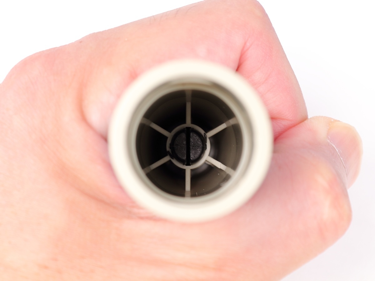 底部は黒いキャップがあり、ひねってツメを外し、引っ張ることで取ることができます。キャップを取ると中は空洞。ここはブレードのケースとなっており、予備のブレードを収納しておけるのが便利です。