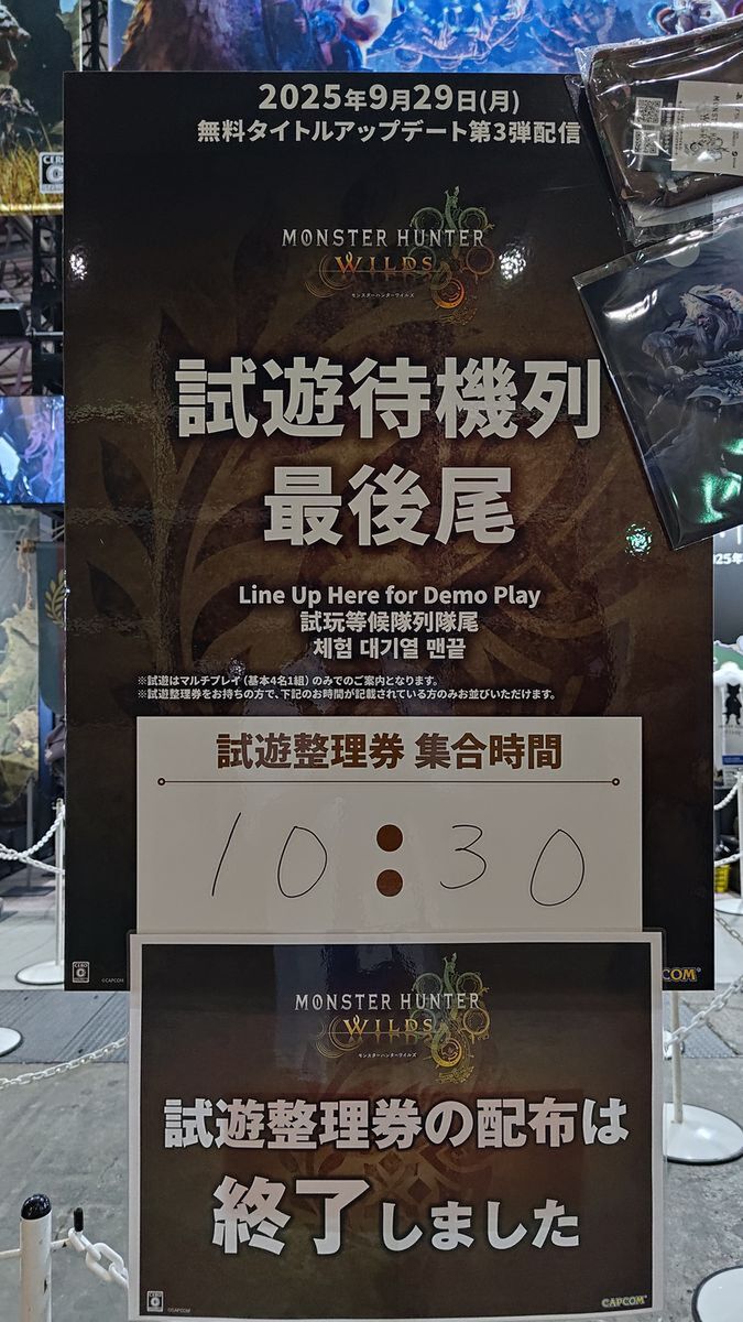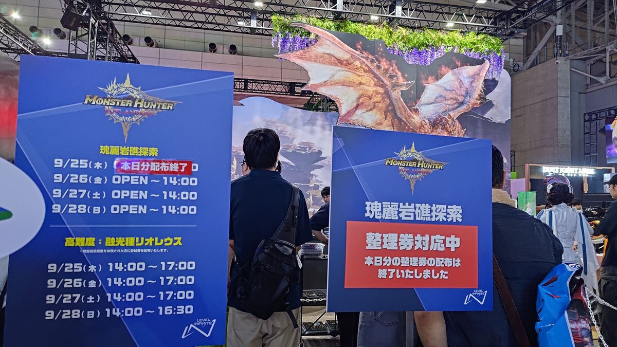 受付を済ませ、一番に気になっていたカプコンブース(ホール7)の「モンスターハンターワイルズ」へと突撃。しかしそこには無情にも「整理券配布終了」の文字が。
