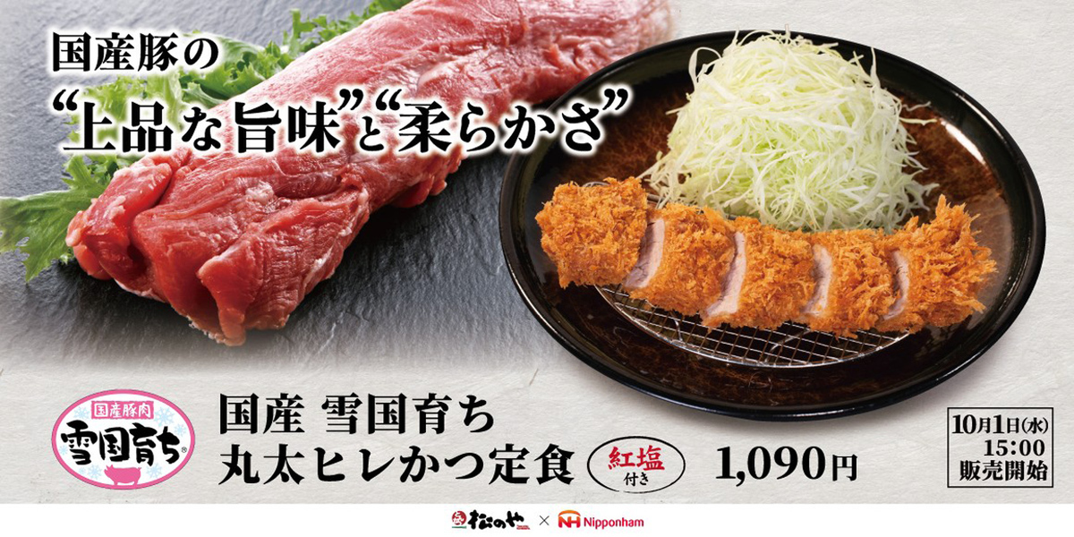 松のやは10月1日15時から、「国産雪国育ち丸太ヒレかつ」を発売します。