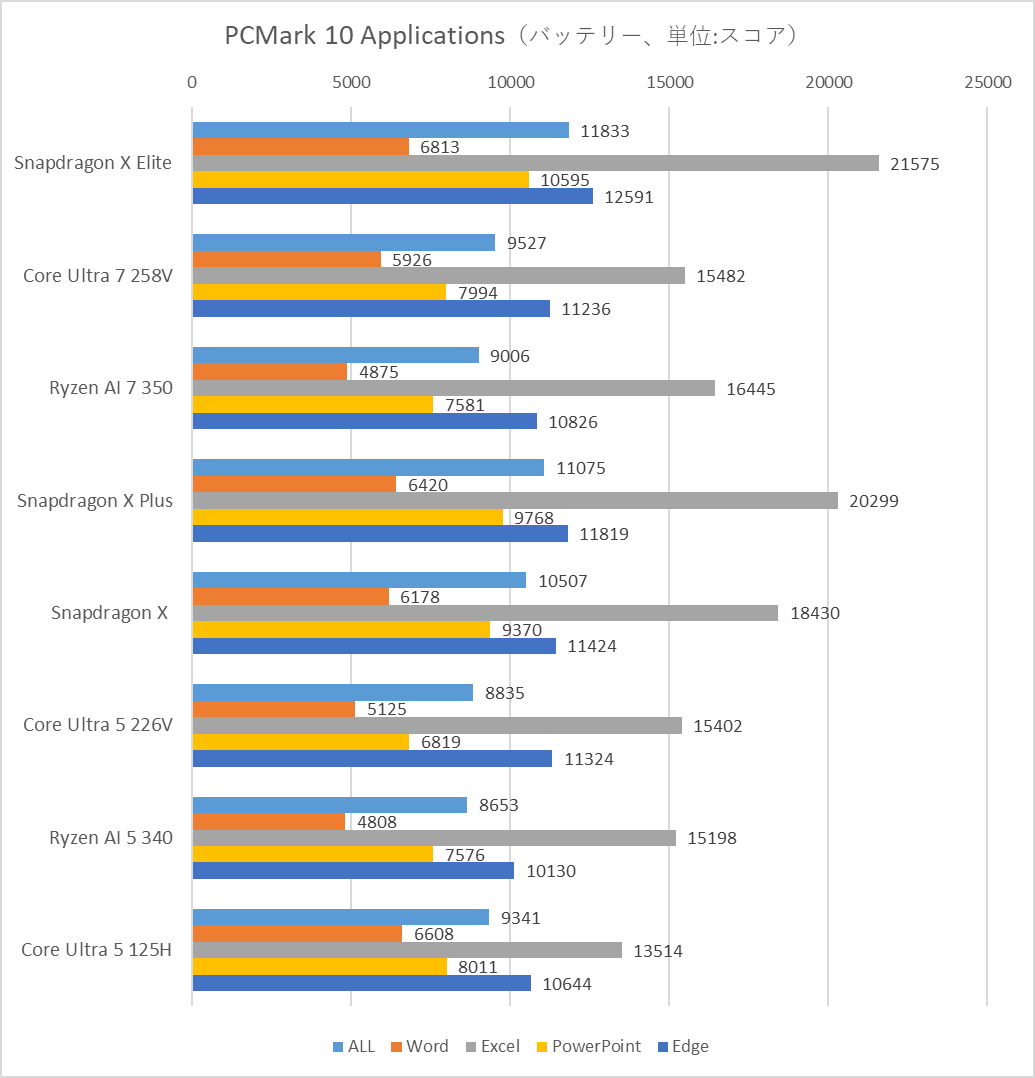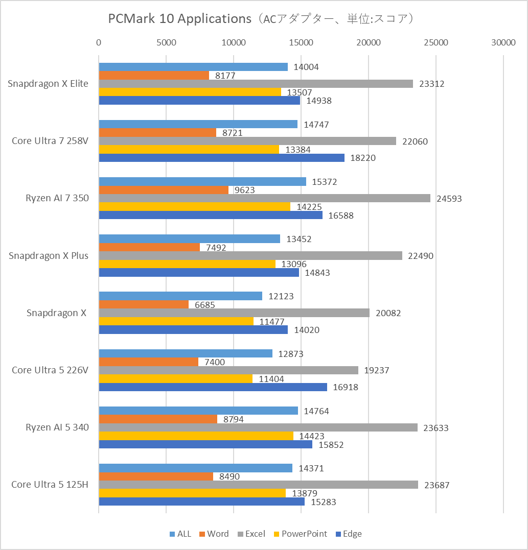 まずはオフィス内など電源に接続できる環境での利用を想定して、ACアダプターを電源に挿した状態でテストを実施した。結果はRyzen AI 7 350、Core Ultra 7 258V、Snapdragon X Elite搭載モデルでそれぞれ高い処理性能を持っており、使用されるアプリによって若干の性能差はあるものの、大きな違いはないものだった。