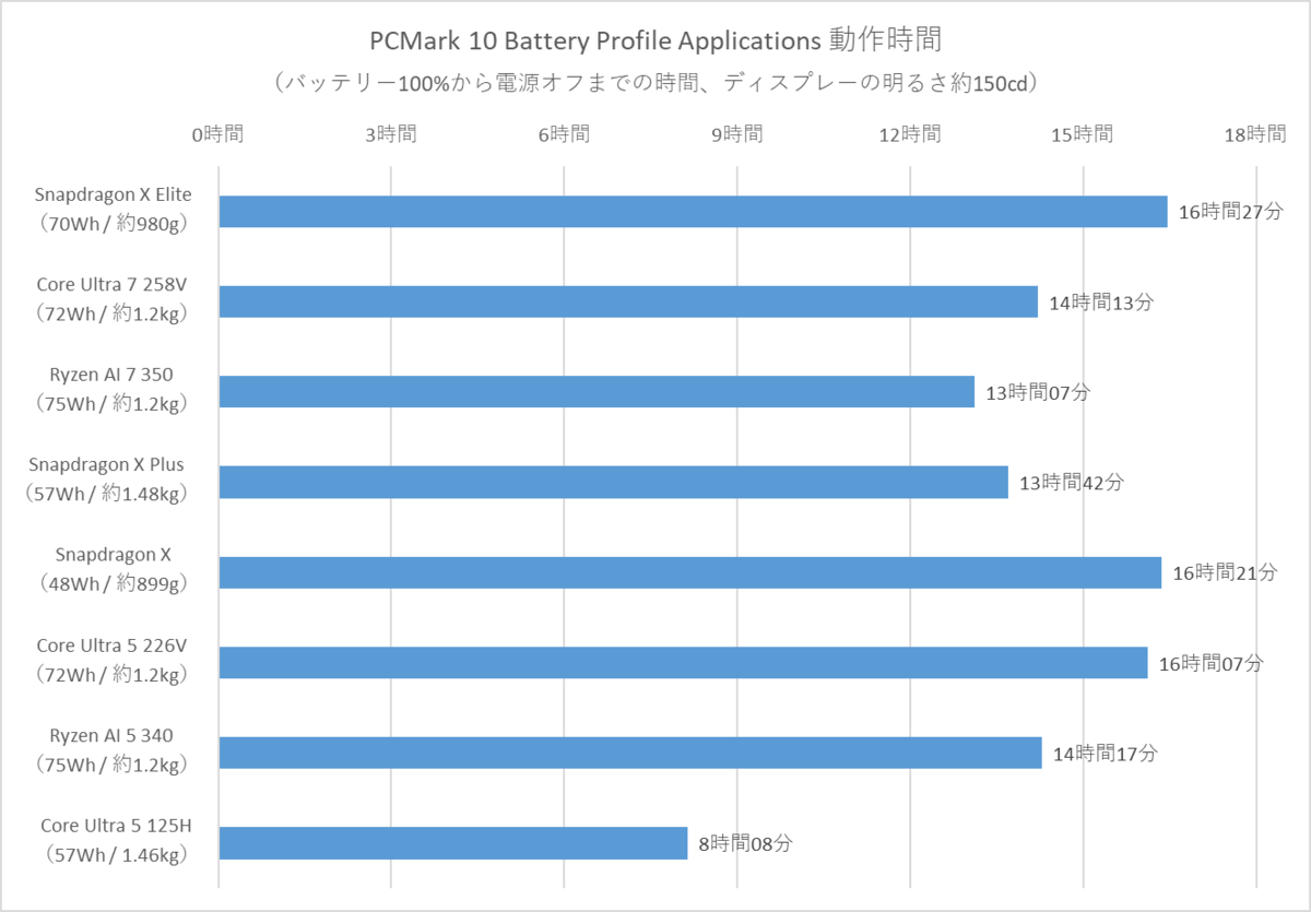 先ほどの「PCMark 10 Applications」でバッテリー駆動時でも処理性能が高い(落ちない)という点を確認できたが、そのうえでバッテリーベンチマークテストの結果を分析すると、Snapdragon X Elite搭載パソコンは総合的なバッテリー駆動時間も長いことがわかる。システムとしてのバッテリー駆動時間はCore Ultra搭載パソコンもほぼ同等という結果が出ているが、Snapdragon Xシリーズ搭載パソコンは重量が約899gと3モデルの中で最も軽く、搭載バッテリーの容量も少ないことを考えると、より軽くバッテリー駆動時間の長いパソコンを作りやすいCPUであることがわかる。
