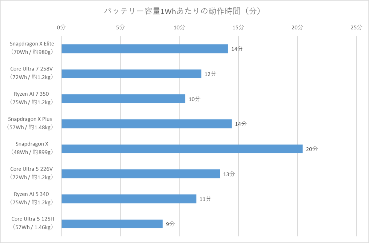 ただ、この比較は各モデルが搭載するバッテリー容量の違いを考慮していない。そこで、各モデルのバッテリー容量の数値から1Whあたりの動作時間を算出したのが下のグラフだ。この結果を見ると、Snapdragon X Elite、Snapdragon X Pro、Snapdragon X搭載モデルは、高性能ながらも消費電力が少ないことがわかる。Snapdragon X搭載モデルはACアダプター接続時には最大性能ではないが、そのぶん省電力性能はほかを圧倒しており、驚かされる。