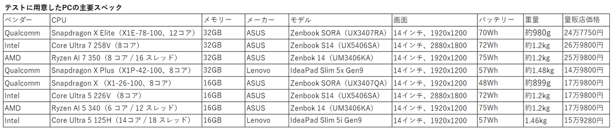 ※ACアダプター接続時はWindows 11「最適なパフォーマンス」、ASUS製品「フルスピードモード」、Lenovo製品「クリエイティブ」に設定。バッテリー動作時はWindows 11「バランス」、ASUS製品「スタンダードモード」、Lenovo製品「適応パワー・モード/共通」での動作に設定した。バッテリーテスト中の画面の明るさは輝度計で約150cd/m2(明るさの設定は各モデルとも60~70%の範囲)に統一している。ドライバーは9月中旬時点の最新のものを利用している。