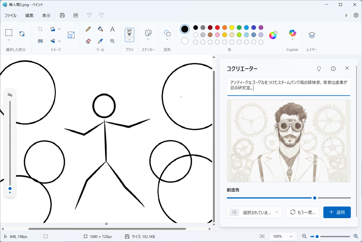 まずは画像生成AIから。Copilot+ PCでは「ペイント」や「フォト」アプリで、画像生成AIの活用やAI画像編集機能などを利用可能だ。なかでもペイントアプリの「コクリエーター」は、簡単な落書きや元画像にプロンプト(文字列)を組み合わせることで新しい画像を生成するオンデバイスAIとNPUを活用した機能となっている。ここでは同じ線画の元画像(1024×1024ピクセル)に同じ文字列を入力し、画像が生成されるまでの時間を計測した。