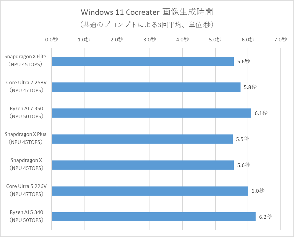 結果はグラフの通り。処理にかかる時間は、Snapdragon X EliteとCore Ultra 7 258Vがほぼ同じとなり、スペックで示されているNPUの処理性能(TOPS値)から見ると意外な結果となった。この差はSoCの処理性能に加えて、NPUドライバーの最適化も大きく影響しているのだろう。Snapdragon XシリーズはCopilot+ PCにいち早く対応したこともあり、AI処理への最適化がより進んでいると見てよさそうだ。