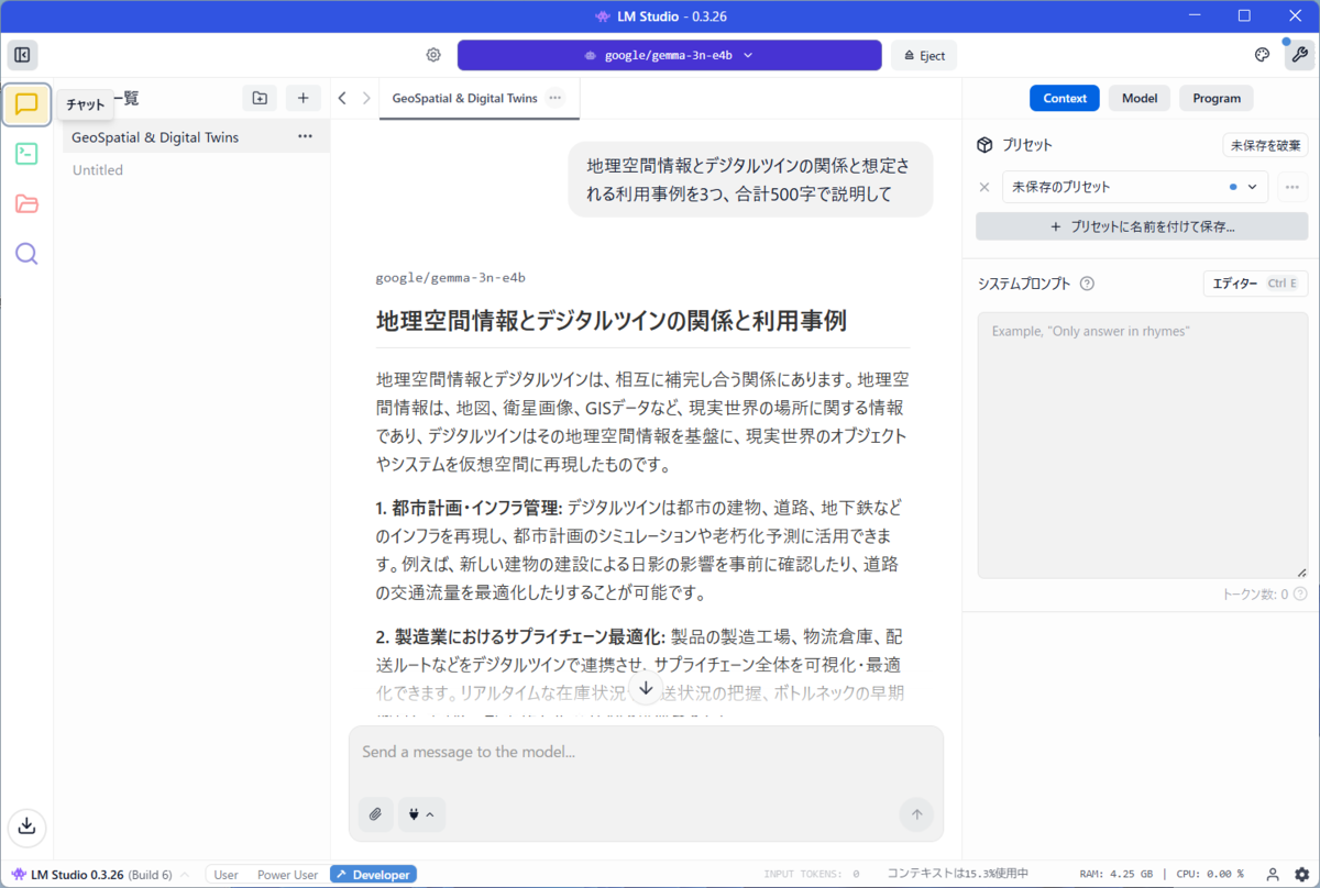 その性能を確かめるため、実際に各モバイルノートPCで注目の大規模言語モデルを動かし、ローカルAIチャットの回答速度を比較した。OpenAIの「gpt-oss-20b」、グーグル「gemma-3n-e4b」を「LM Studio」で動かし、あるビジネス分野に関する内容と事例を500字で説明させた。