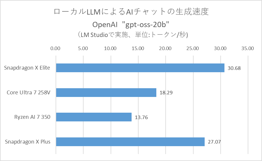 gpt-oss-20bはPCのメモリーをおよそ20GB必要とすることから、メモリー32GB搭載モデルのみでテストを行った。結果、AIチャットの応答速度となるファーストトークンは1秒台、回答の生成速度となるトークン/秒はSnapdragon X Eliteが良好な結果となった。