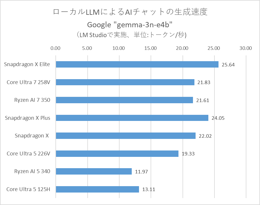 なお、この結果はローカルLLMの実行環境が各社SoCへの最適化を進めた場合のほか、利用環境やモデルの違いによっても大きく変わる。あくまでも汎用モデルを利用した現時点での目安と捉えて欲しい。