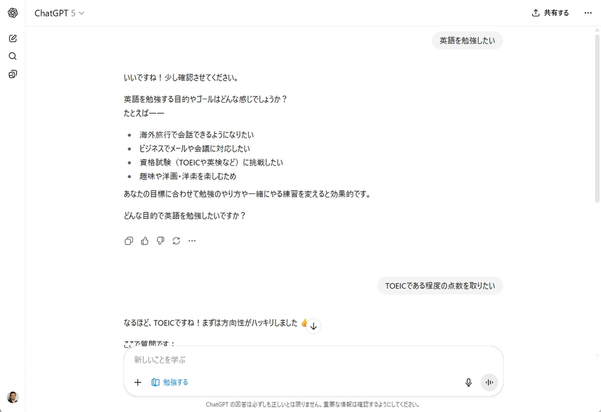 ChatGPTは、どんな目的で英語を勉強するのか尋ねてくる。確かに、洋画を見るためなのか、ビジネスで使うのか、TOEICに挑戦するのかで勉強方法は変わる。そこでTOEICのため、と回答したところ、現在の実力や目標点数を聞いてきた。しっかりと、学びのプランを作ってくれるのが凄い。