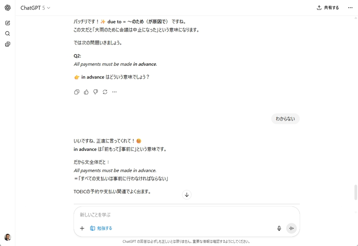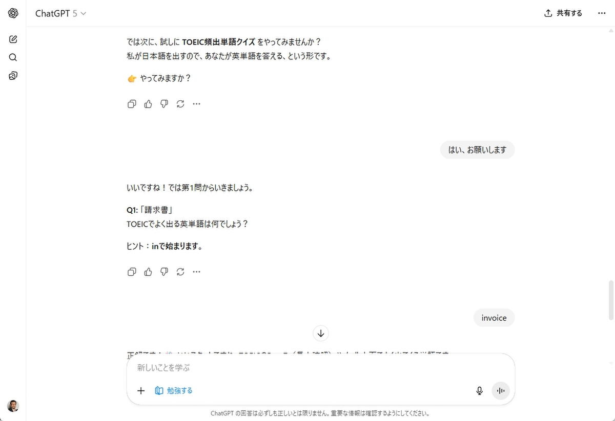 プラン作成だけでなく、実際に問題を出してもらい、添削してもらうことも可能。最初は単語だけだったが、「もっと難しく」や「ヒントは不要」、もしくは「熟語も勉強したい」などと何でも要望を伝えていい。気になることがあったら、何でも質問しよう。わからないならわからないと答えてOK。不正解なら丁寧に解説してくれる。