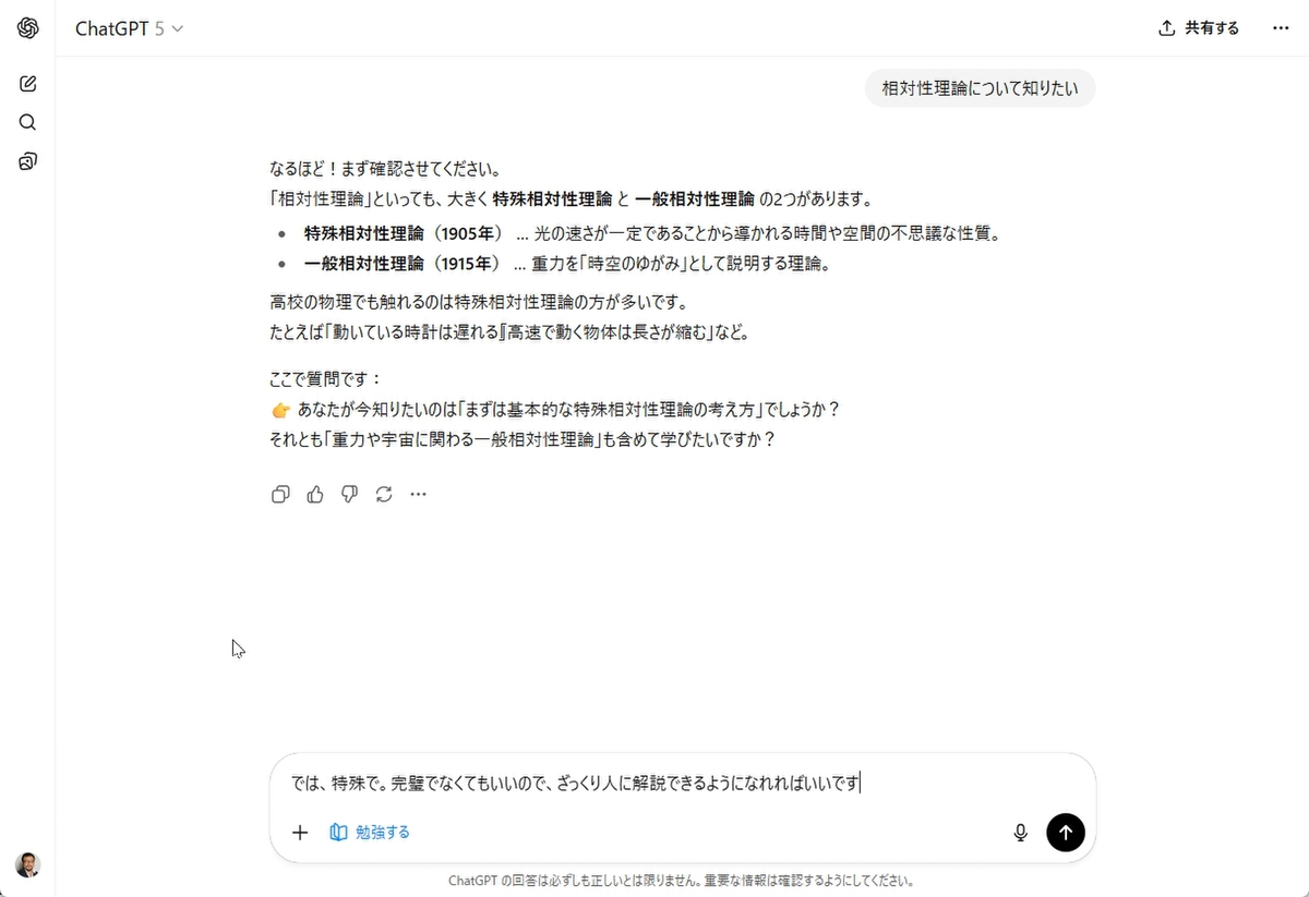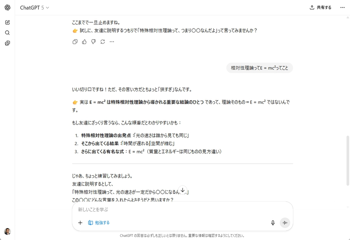 今回、「人に説明できるようになりたい」と伝えたところ、一通り学習したあと、説明するように指示してきた。そして、回答すると、褒めつつもダメ出しして、また親切に解説してくれる。ChatGPTがユーザーの理解レベルを把握し、適切な教え方をしてくるので、学習のモチベーションも維持しやすい。