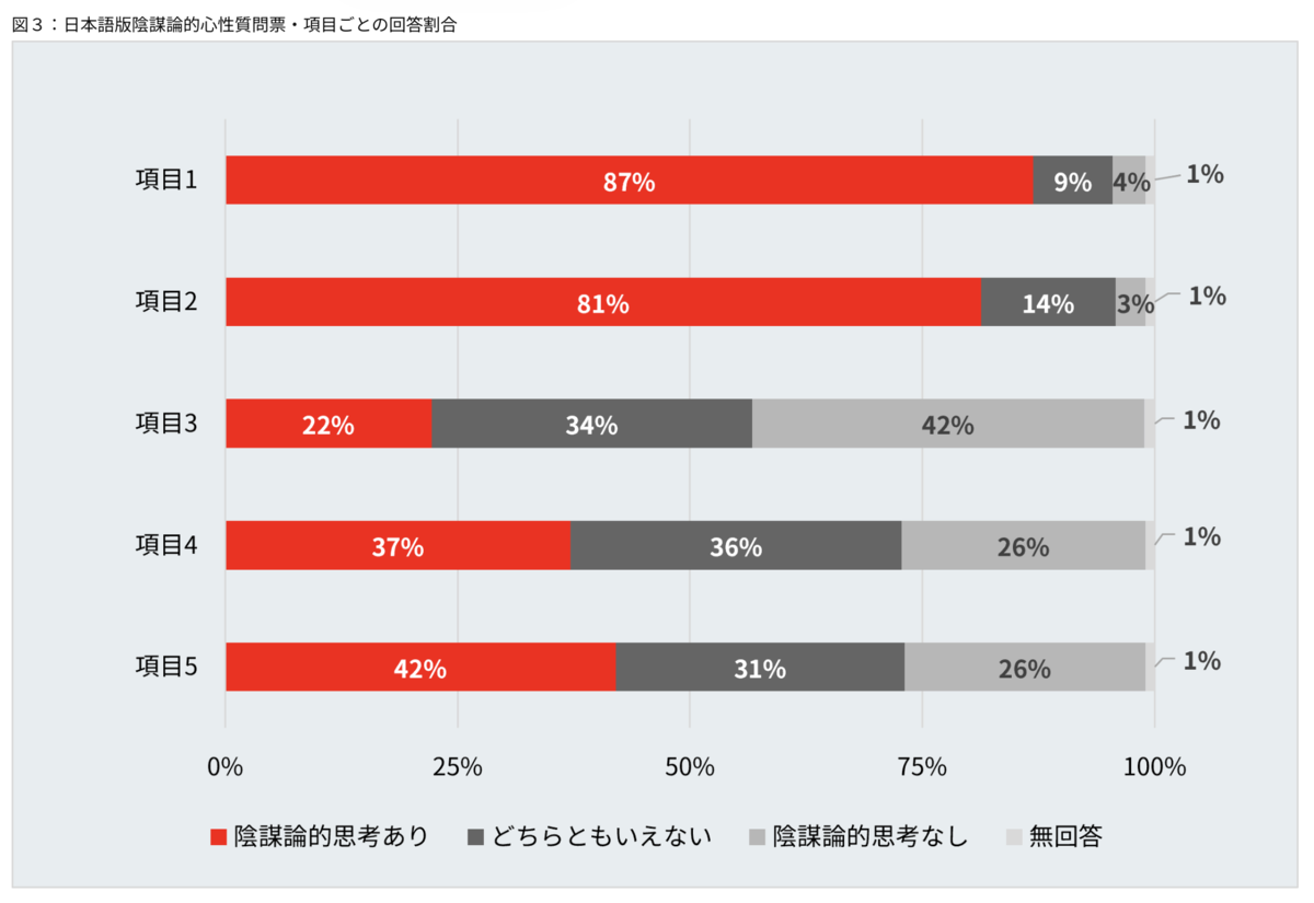 それぞれの項目について回答してもらったところ、項目1(極秘の事案)および項目2(隠された動機)に関して、8割超の人が陰謀論的思考に賛同していた。つまり、誰でも陰謀論者になる可能性があるということなのだ。