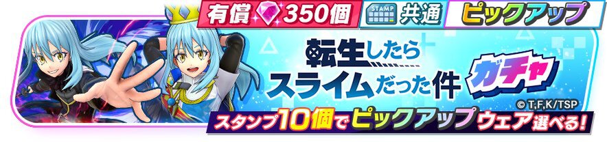 リムル(CV:岡咲美保さん)の2種類のバトルウェアがピックアップで登場し、ウェポンチップやヒーロー専用アクセサリーも登場。また、1日1回無料でまわせるほか、10連ガチャを2回まで有償ジュエル350個でまわすことが可能だ。開催期間は、2025年10月14日15時59分(予定)まで。