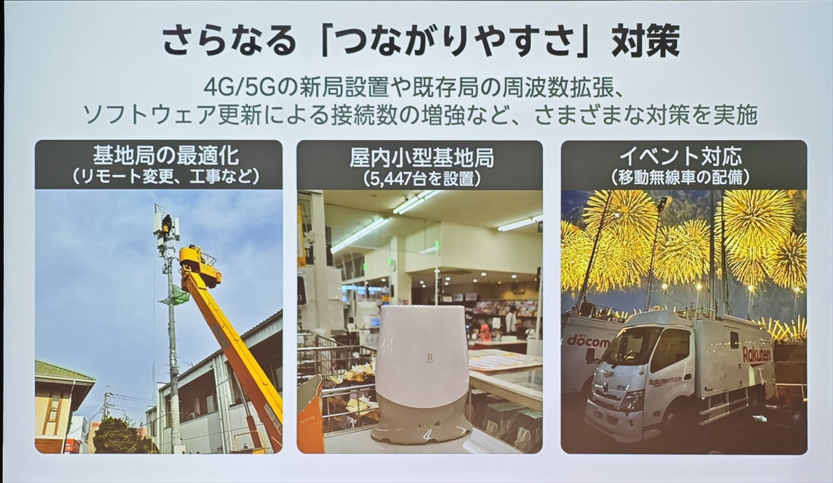 さらに、AIを活用した基地局の電力消費最適化技術「RIC(RAN Intelligent Controller)」を導入。これにより、年間で電力消費量を20%削減することに成功しており、電気料金高騰の影響を吸収していると説明しました。三木谷会長は、こうした「イノベーションに裏打ちされた低価格と高品質なサービス」の実現を強調しました。