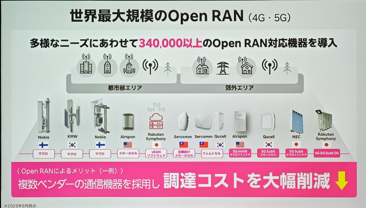 この「低価格継続宣言」を可能にしている背景には、楽天モバイル独自のネットワーク技術があります。世界で唯一、ネットワークを完全仮想化していることにより、設備投資を約40%、運用費を約30%削減しているといいます。また、オープンな規格である「Open RAN」の採用により、特定のベンダーに依存せず、競争力のある価格で機器を調達できる強みも持っています。