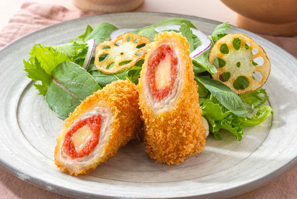 「明太チーズ巻きかつ」はぐるりと巻かれた中身がとっても綺麗な一品。食卓に並んでいたらテンションも上がりそう。