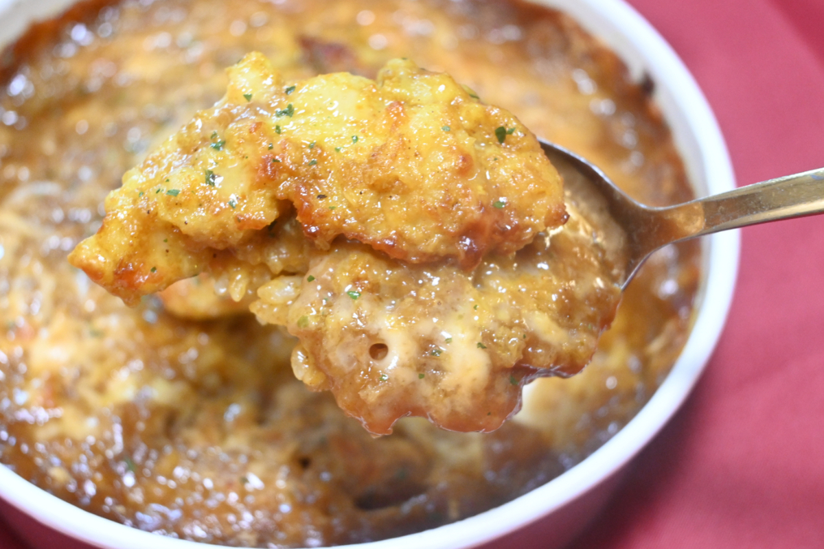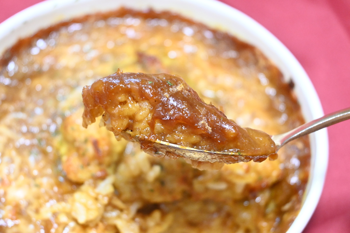 焼カレーならではの炙りの香ばしさも食欲をかきたててきます。あと、圧倒的なカレーなおいしさで影が薄くなってしまったのですが、チーズも使われていて、チーズのコクもおいしさを後押ししていますよ。