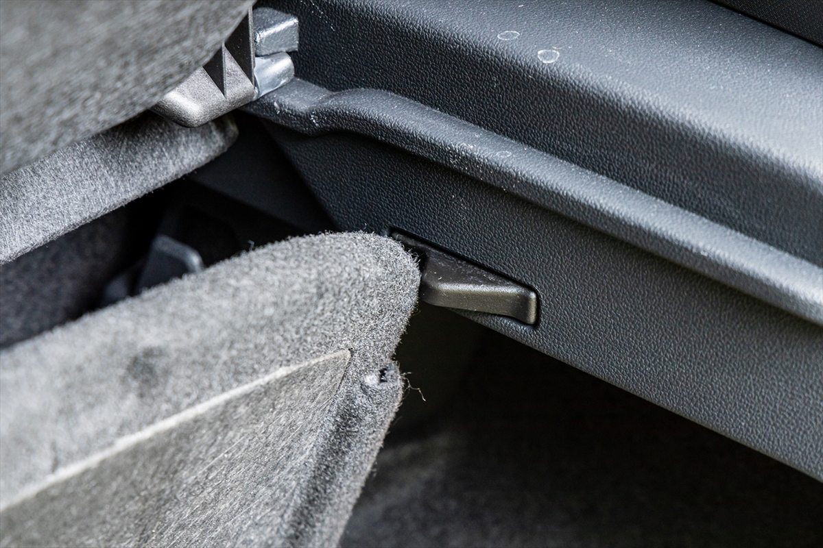 荷室は後席をたたまない状態で455リットルと大容量。背もたれを倒せば1281リットルに増えます。床面の下にも収納スペースはありますが、タイヤが丸見え状態なのでプライバシートレイを置くのが使い道かなと。一方でフタを止めるストッパーがあるのはとても便利。後席を倒した際、床面はかなりフラットになるのも美質です。