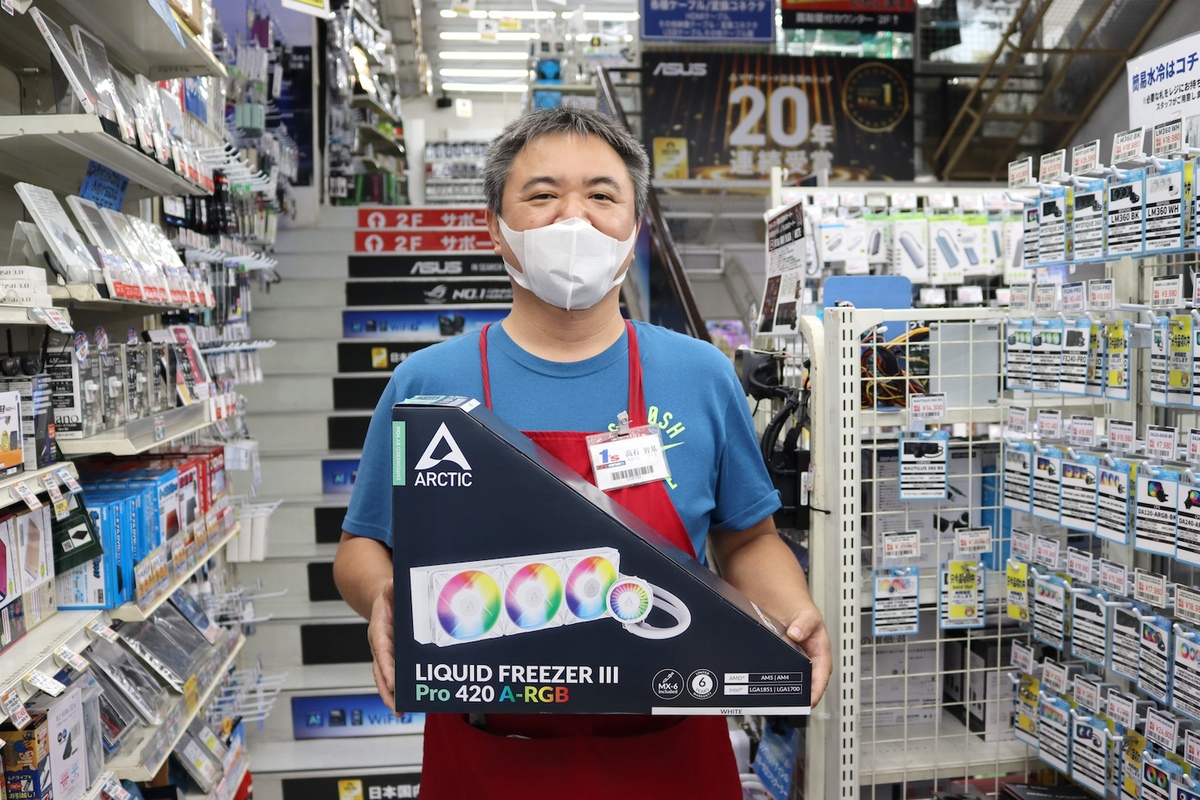 大阪・日本橋のPCパーツショップ「PCワンズ」を取材しました。今回、店舗スタッフの高石智基さんがオススメする製品は、ARCTICの水冷CPUクーラー「Liquid Freezer III Pro 420 A-RGB (White)」です。
