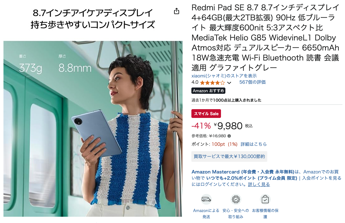 Amazonタイムセールに、シャオミの激安タブレット「Redmi Pad SE 8.7」が登場中。