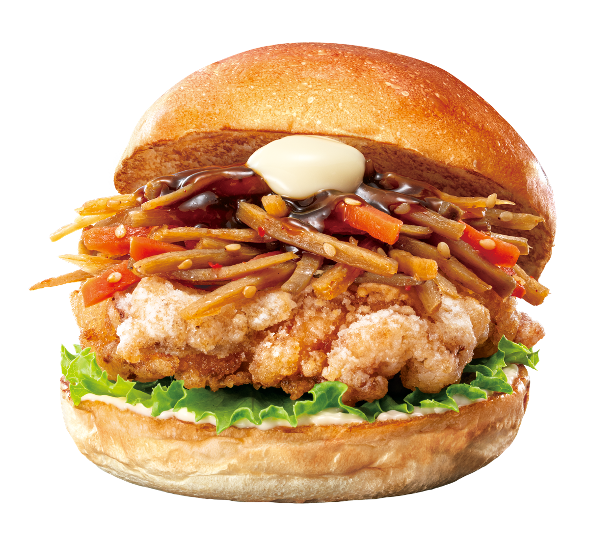 店内で手仕込みしたチキン竜田に、国産ごぼうとにんじんを使ったきんぴらを合わせ、特製てりやきソース、レタス、マヨネーズをふんわりバンズで挟んだ一品です。