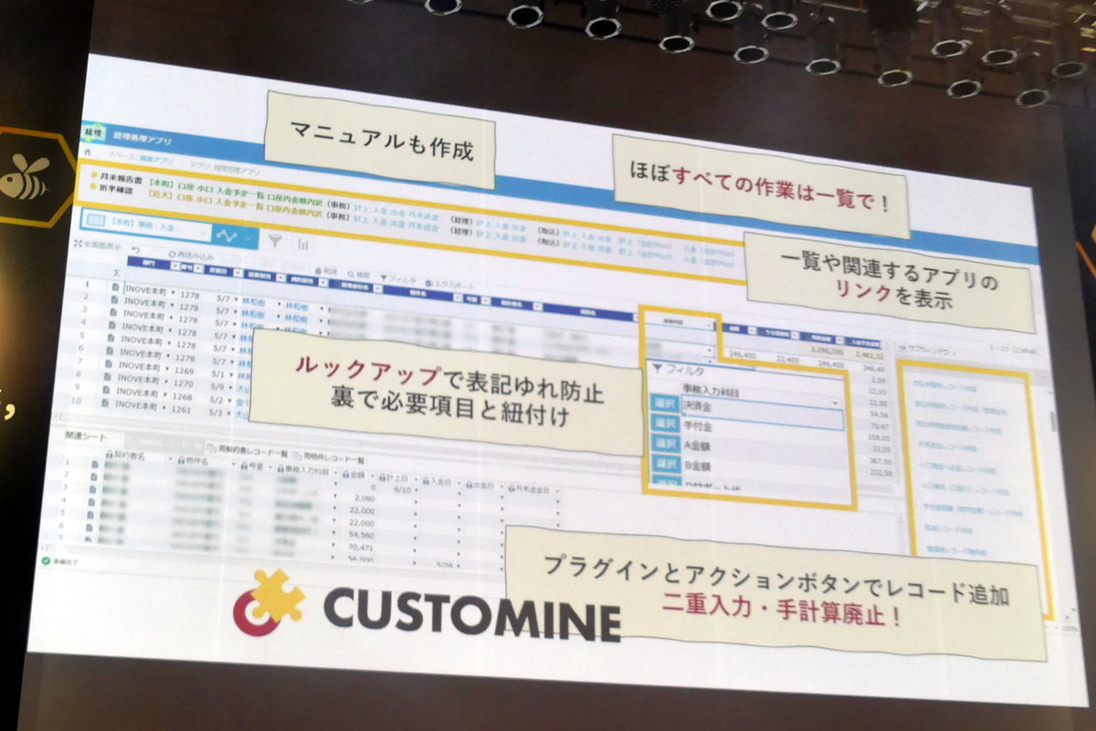 また、もともとExcelだったテーブルもCUSTOMINE(アールスリーインスティテュート)を用いることで、ほぼすべての作業を一覧から行なえるようにした。プラグインとアクションボタンでレコードを追加できるようにし、手間だった二重入力や手作業を廃止。一方、アクションボタンは17もあるので、詳細画面でいつでも利用方法を調べることができるようになっているという。