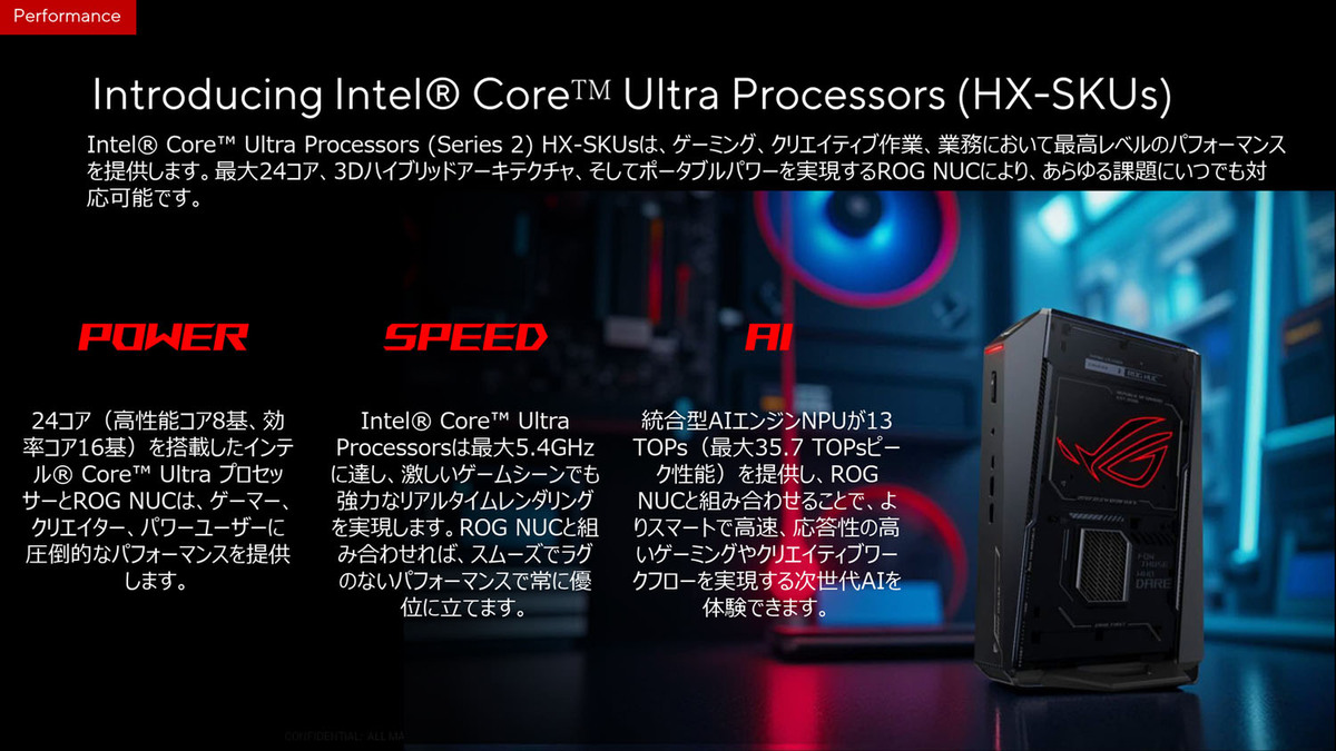 ROG NUC (2025)の心臓部には、Core Ultra 9 275HXが搭載されている。最大24コアを誇るインテルの最新CPUは、前世代を最大18%上回る性能向上を実現し、AIエンジンNPUによるスマートで高速な処理能力を提供する。