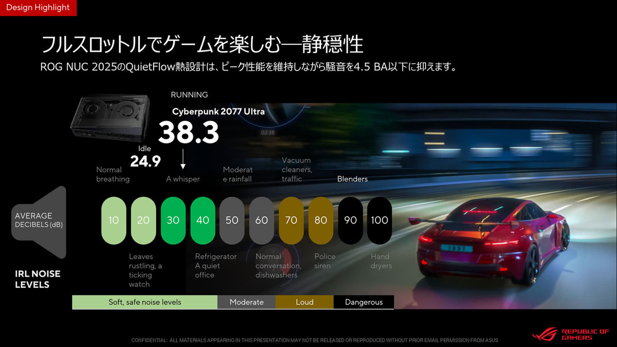 その結果、ゲーム「サイバーパンク2077」を高設定でプレイ中の騒音レベルは38.3dBAと、静かなオフィス(40dBA)以下に抑えられている。アイドル時には24.9dBAというささやき声(30dBA)よりも静かなレベルを実現し、プレイヤーは騒音に邪魔されることなくゲームの世界に没頭できる。