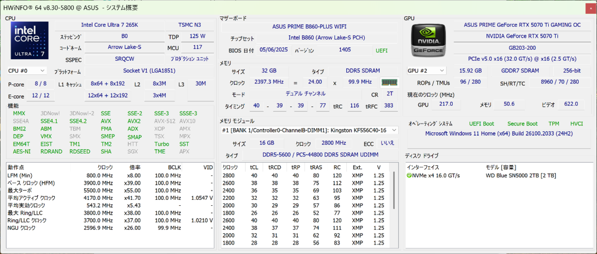 メモリーは「Kingston FURY Beast DDR5 DDR5-5600」の16GB×2で、ストレージはNVMe PCIe 4.0対応の「Western Digital - BLUE SN5000 NVME SSD」2TBモデルを搭載。